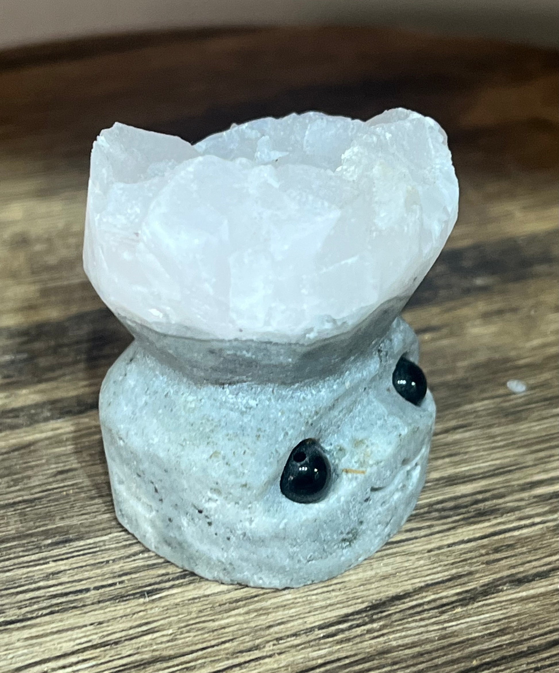 Carved from pink calcite, she radiates gentle, heart-healing energy — the kind that soothes your soul and reminds you to love yourself first. When the lights go down, Rosie reveals her secret power — she glows beautifully under UV light, shining her loving aura even brighter.