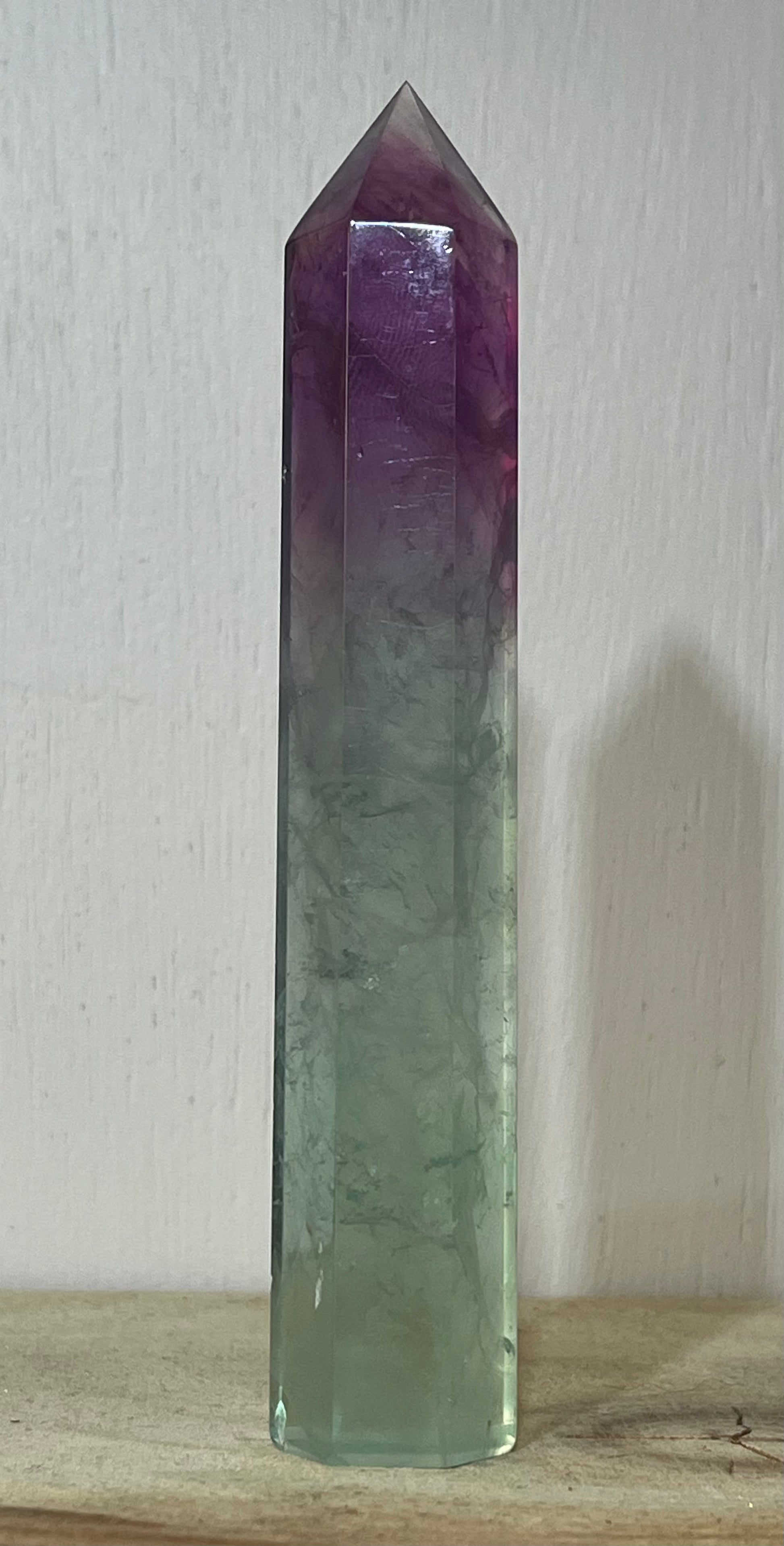 This beautiful 14cm Candy Fluorite tower flows from juicy violet into cool seafoam green, with an amazing natural rainbow shimmering within the upper point.