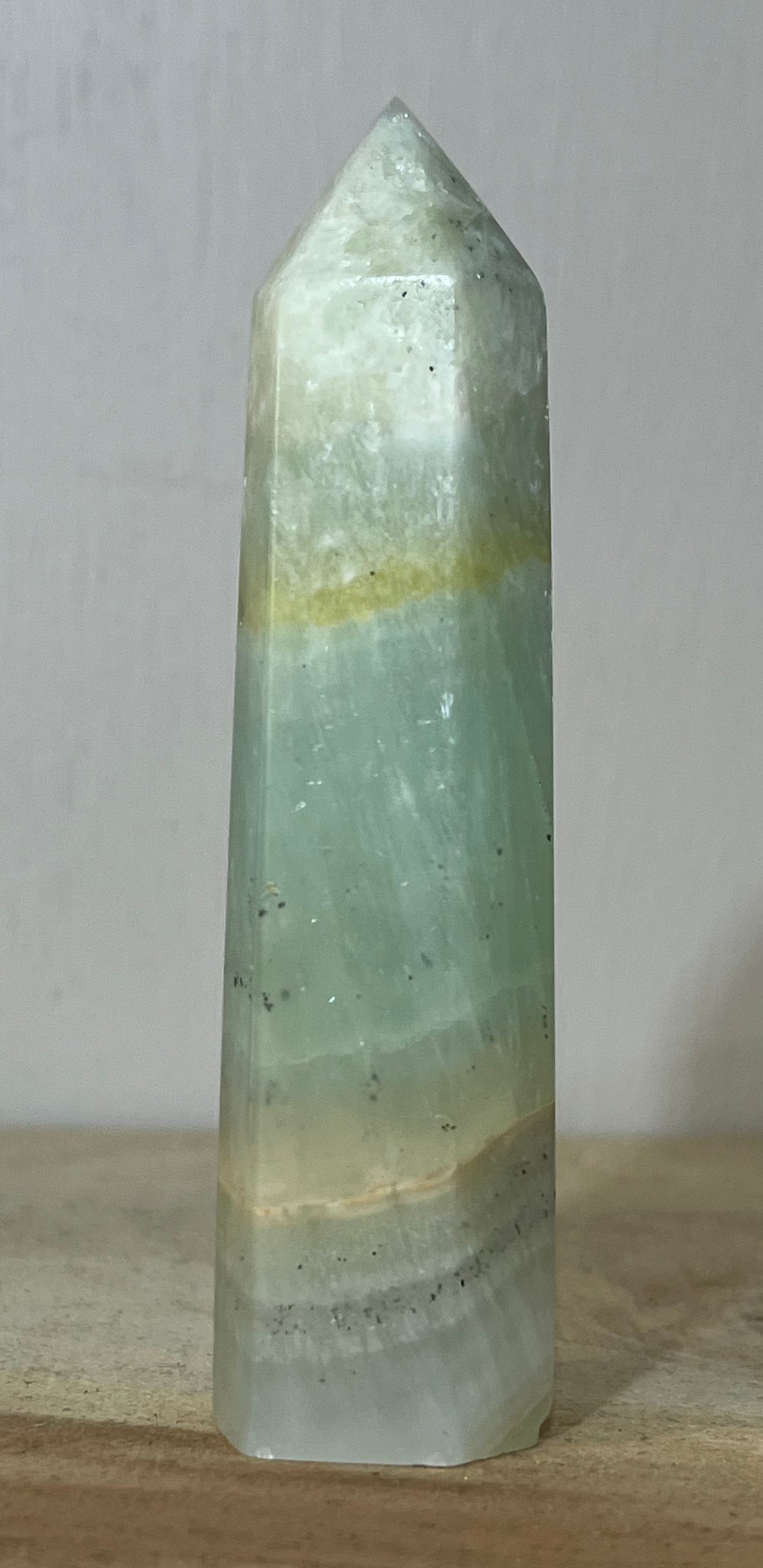 This beautifully layered tower measures approximately 10cm and glows with serene green and honeyed tones, perfect for meditation, energy work, or creating a tranquil atmosphere in your sacred space.